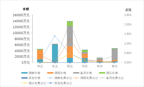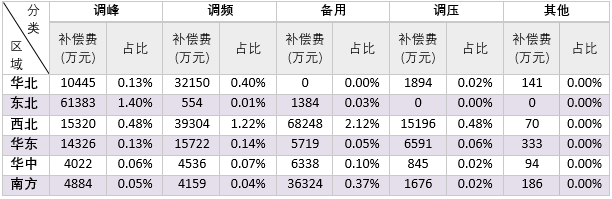 从电力辅助服务补偿总费用来看,补偿费用最高的三个区域依次为西北、东北和南方区域,西北区域电力辅助服务补偿费用占上网电费总额比重最高,为4.29%,华中区域占比最低,为0.25%(见图1)。