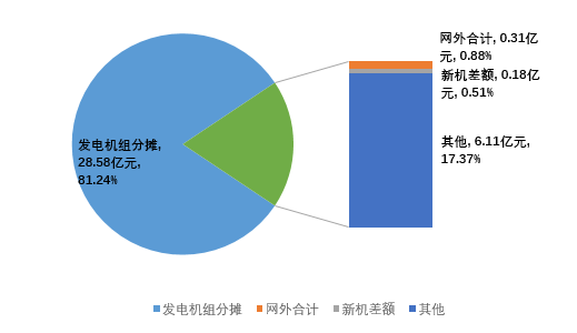从电力辅助服务补偿费用来源来看,主要来自发电机组分摊费用,合计28.58亿元,占比为81.24%。其他还有,跨省区(网外)辅助服务补偿分摊费用合计0.31亿元,新机差额资金0.18亿元,考核等其他费用6.11亿元,无分摊减免费用(见图4)