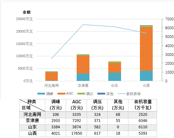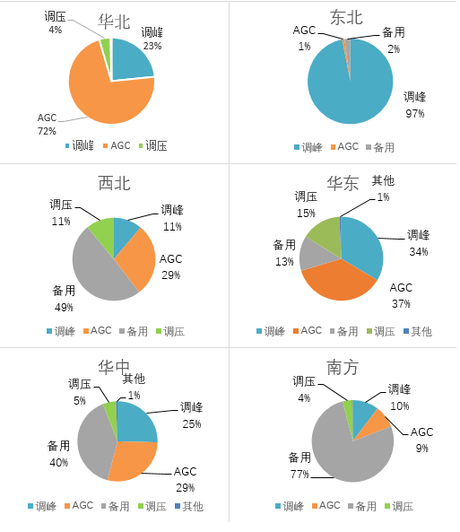 从分项电力辅助服务补偿费用来看,调峰、AGC和备用补偿费用占总补偿费用的90%以上。其中,西北、东北区域调峰补偿力度最大,华北、华东区域调频(西北区域调频为AGC加一次调频,其他区域调频为AGC)补偿力度最大,南方、华中区域备用补偿力度最大。总体来看,西北区域整体电力辅助服务补偿力度最大(见图3)。